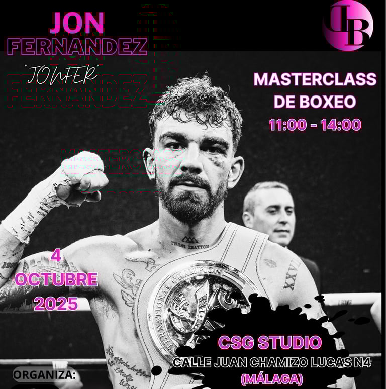 En esta ocasión tuvimos el placer de poder organizar un evento con el boxeador más prestigioso del actual panorama español. Su nombre es Jon Fernández y pudo acompañarnos en una masterclass en Málaga; en concreto, en el gimnasio CSG STUDIO con su gerente César, al que estamos muy agradecidos por su disposición y su trato, tanto profesional como personal.